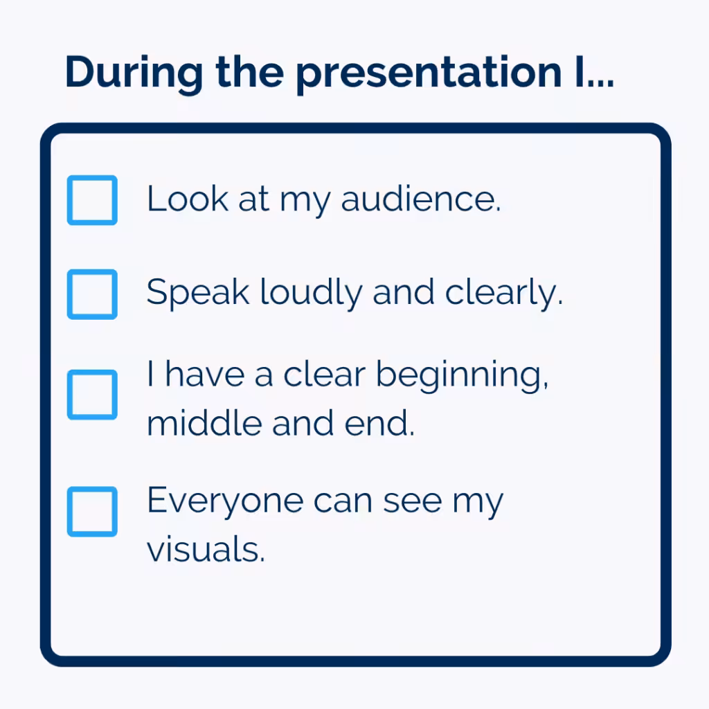 As part of your project you are going to present your campaign to your school community first. Before any presentation it is really important to practice! Check out the important parts of a good presentation. Practice with a friend and have them give you feedback on your oral presentation: